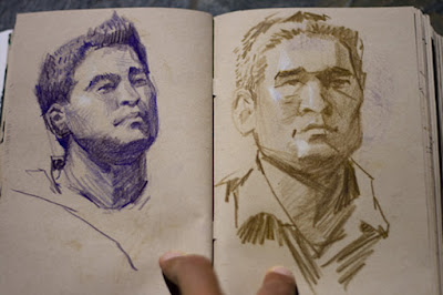 Generals 6B graphite stick - fill big areas quickly. Primsacolor Ebony pencil jet black, extra smooth - draw smaller detail with rich black. Dixon Ticonderoga, soft pencil - for drawing detail and building gradients. Mars Steadtler plastic eraser - for wholesale erasing. Tuff Stick eraser - for precision erasing. Kneaded eraser - for lifting graphite in a more delicate manner. Pencil sharpener - get a new one more often than you think. India ink, waterproof - draw and make textured backgounds. Big paint brush - for splattering paint like a wild man. Small round brush - must have rolled away while I was taking a photo!